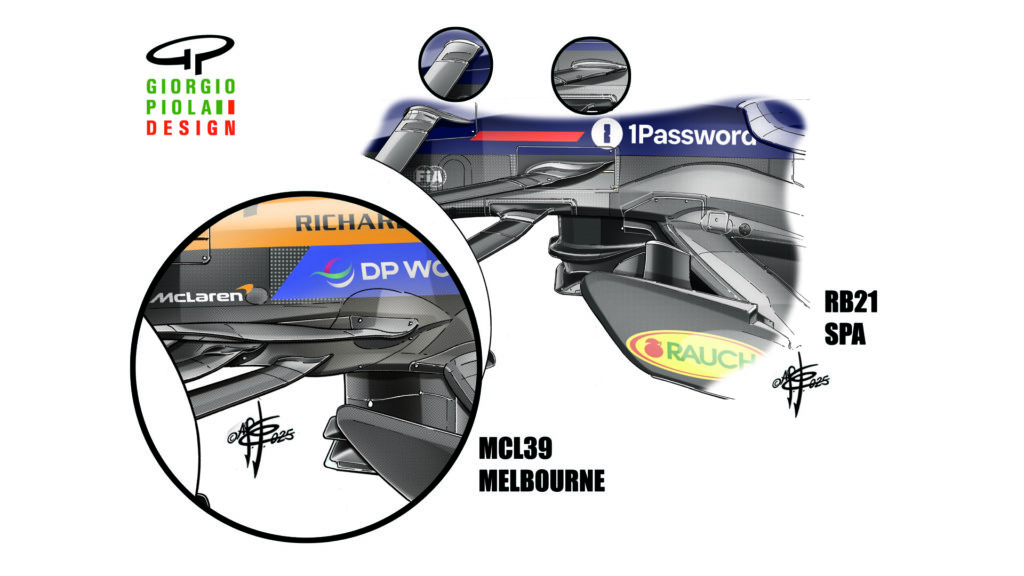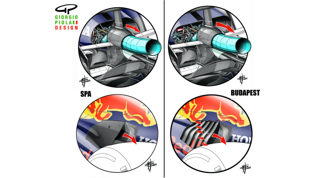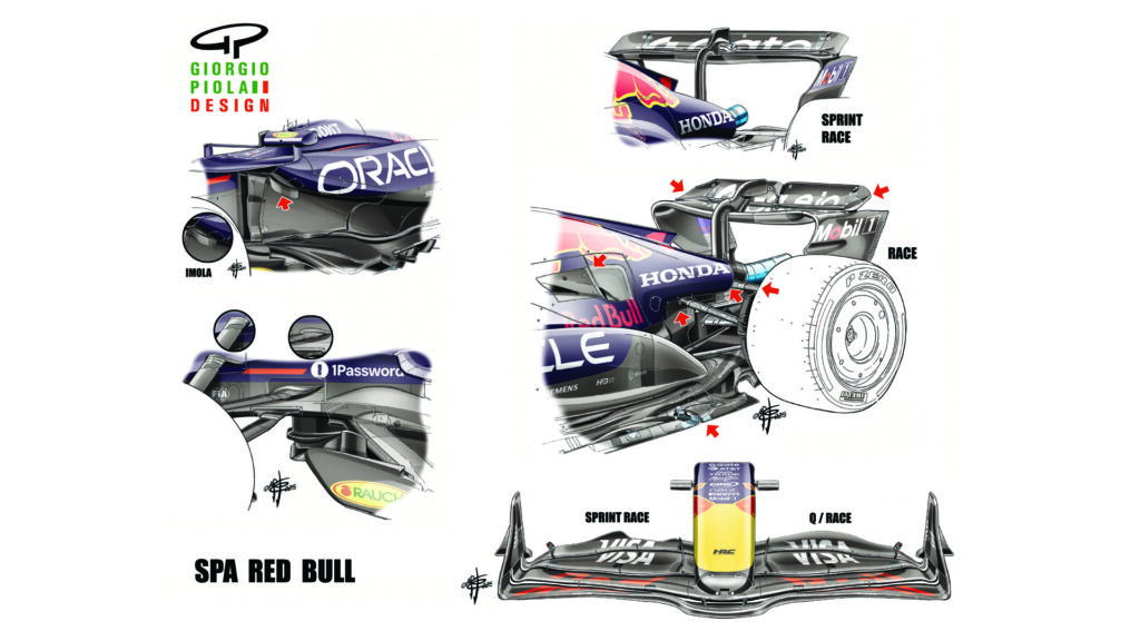 Red Bull introduced at Spa a massive aero update in all the sector or the car: front wing, side pods inlet, floor, engine cover with a “McLaren style” central oval…