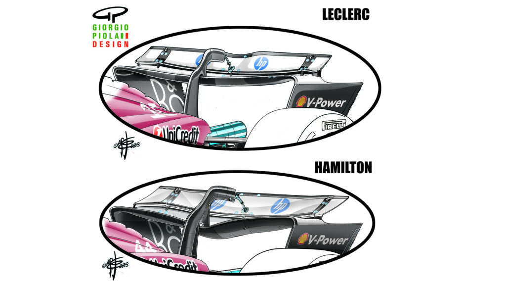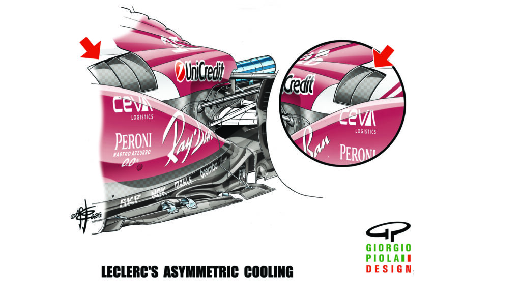 On Leclerc’s SF-25 the cooling was asymmetric while on Hamilton’s both sides had 2 louvres.