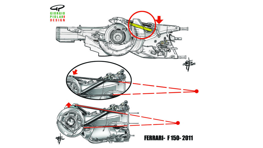 Ferrari tested in Mugello the new rear suspension to be raced at Spa. Note the lower pick up point of the top wishbone front leg.