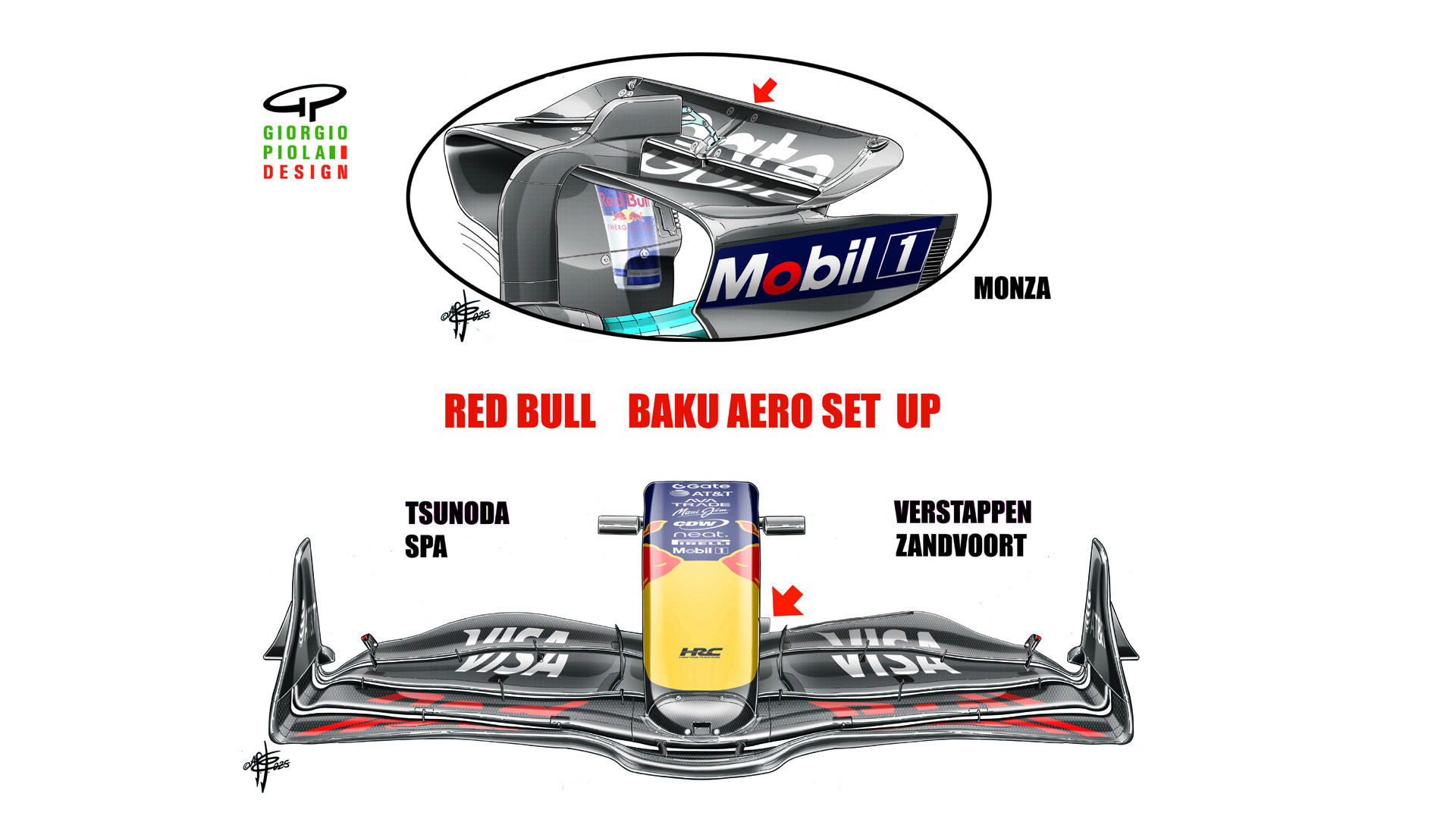 Red Bull expecially on Verstappen car choose a very different aero set up: low downforce rear wing (Monza spec. with gurney flap) and medium downforce front wing (Zandvoort spec.) while Tsunoda with Spa spec. for the front wing.