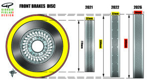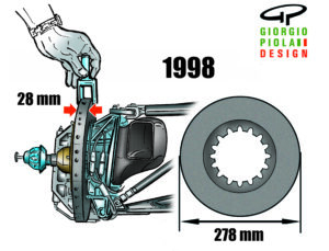 The diameter of the brake discs (278 mm) remained unchanged from 1998 until the introduction of 18″ rims in 2022, when it increased to 330 mm, while the thickness remained unchanged (32 mm). For the 2026 season, the diameter will become 345 mm and the thickness 34 mm. The rear discs are very small, even beyond the 278 mm limit, especially considering the size of the rims (18″).
