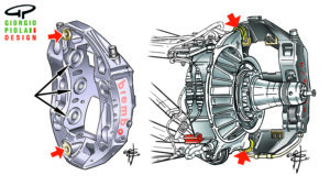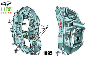 With the maximum limit on the number (6) of pistons for brake calipers abolished, the 8-piston caliper introduced by Brembo in 1995 (sketch from that period) may make a comeback. On the right is a more accurate reconstruction made in 2022.