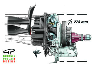 “Yes, let’s say the regulations set the maximum, not the minimum. So, a four-piston caliper with disc dimensions very similar to this year’s—280 mm, but increased to 34 mm in thickness. The focus will be on a very small, very light system because the rear will be heavily influenced by the energy recovery, which will increase, and so everyone will try to make the system as compact as possible. The real challenge is that, for most of the time, the rear system will hardly be used. However, there will be situations where, with a fully charged battery or when energy recovery is not possible, the brake will actually have to do the work it used to do in the past. So we expect a big difference between standard conditions and maximum conditions. Obviously, the brake is sized to withstand the maximum torque it will experience. The trick is to make it function correctly even when most of the braking energy is being absorbed by the engine. The challenge is to have a material ready even when cold, with a wide temperature range, to provide the correct performance.”