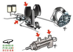 Almost all teams now have a tandem pump, meaning a single pump with two chambers inside: one operating the front system and one operating the rear system. The rear system is controlled by the BBW (Brake-By-Wire), so in reality the rear pump almost never works except in the case of a BBV (Brake-By-Vehicle) failure. In that case, the driver can actually brake using the calipers; otherwise, rear pressure is always managed by the BBV.”