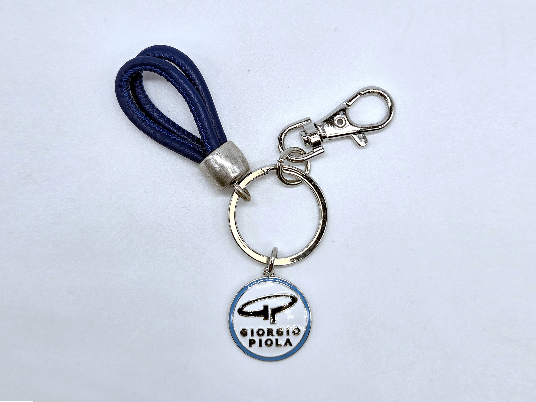 Keyring with Giorgio Piola medal in chrome-plated metal hand-enamelled in three colours and blue leather details. The keyring includes a carabiner clip so it can be easily hung anywhere