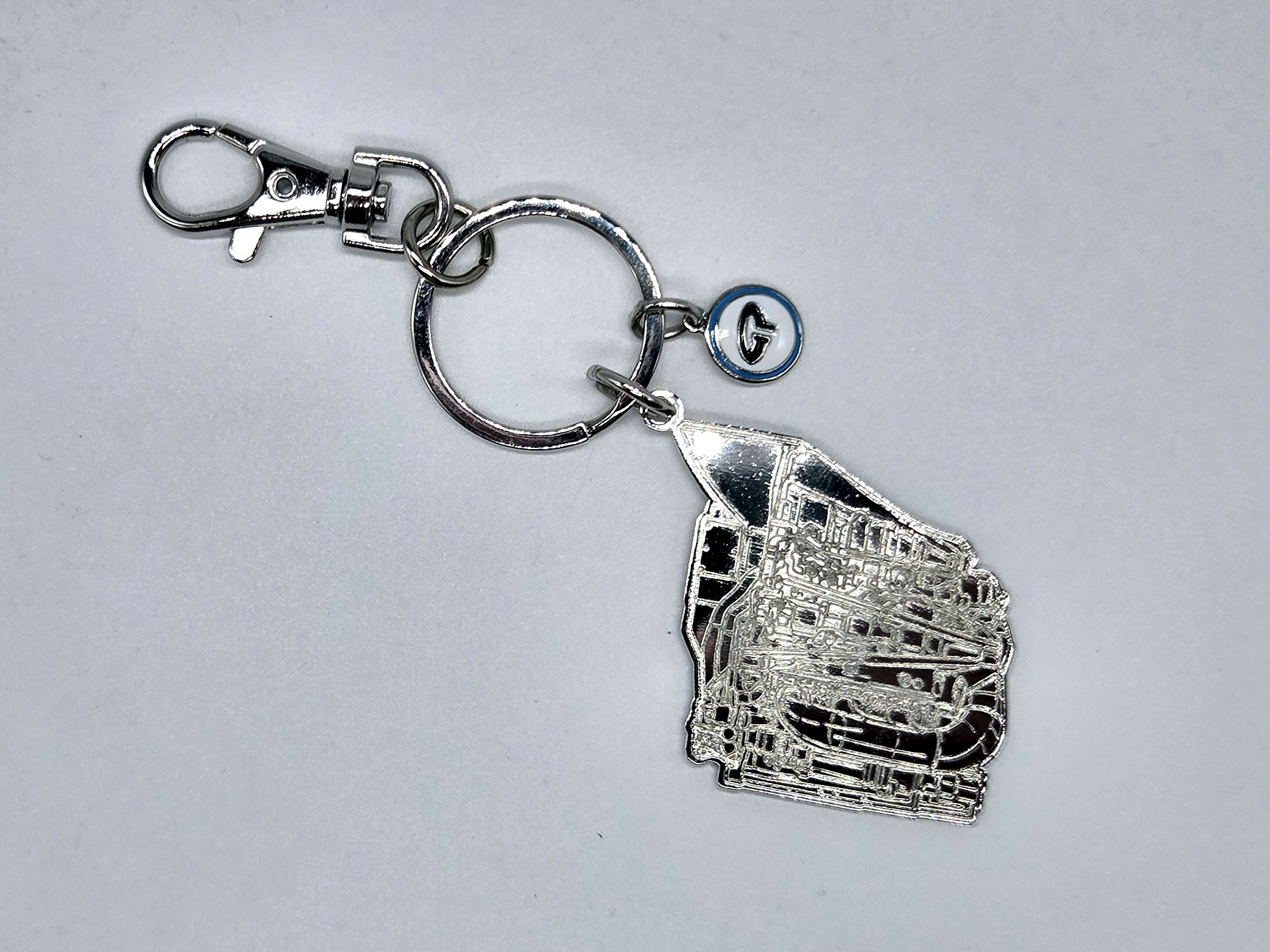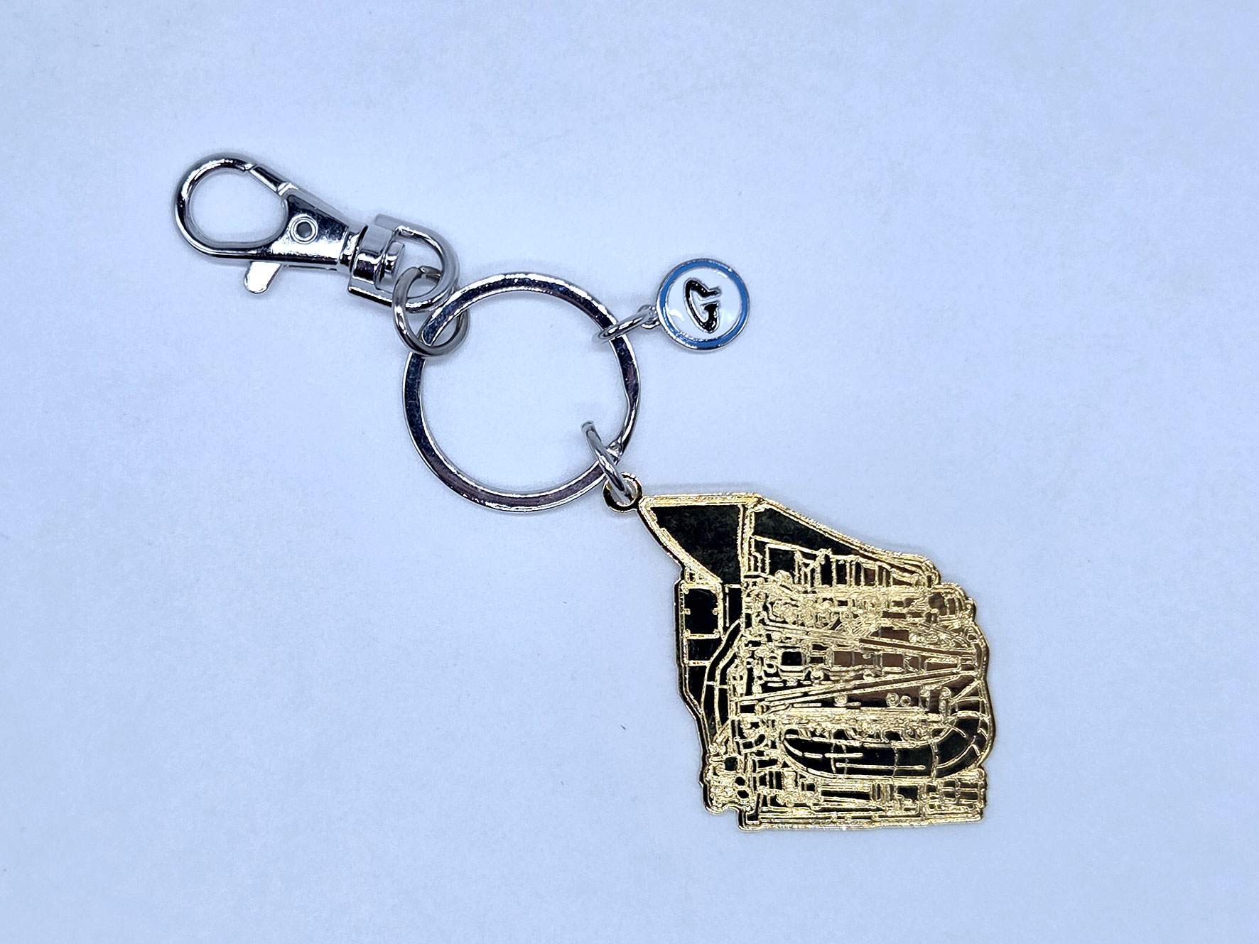 Keyring with Honda-style F1 engine based on Giorgio Piola’s original design and featuring Giorgio Piola’s signature on a hand-enamelled chrome medallion. The brass engine with high-quality gold-silver-antique gold-antique silver finishes measures approximately 53×50 mm. The keyring includes a carabiner so it can be easily hung anywhere.