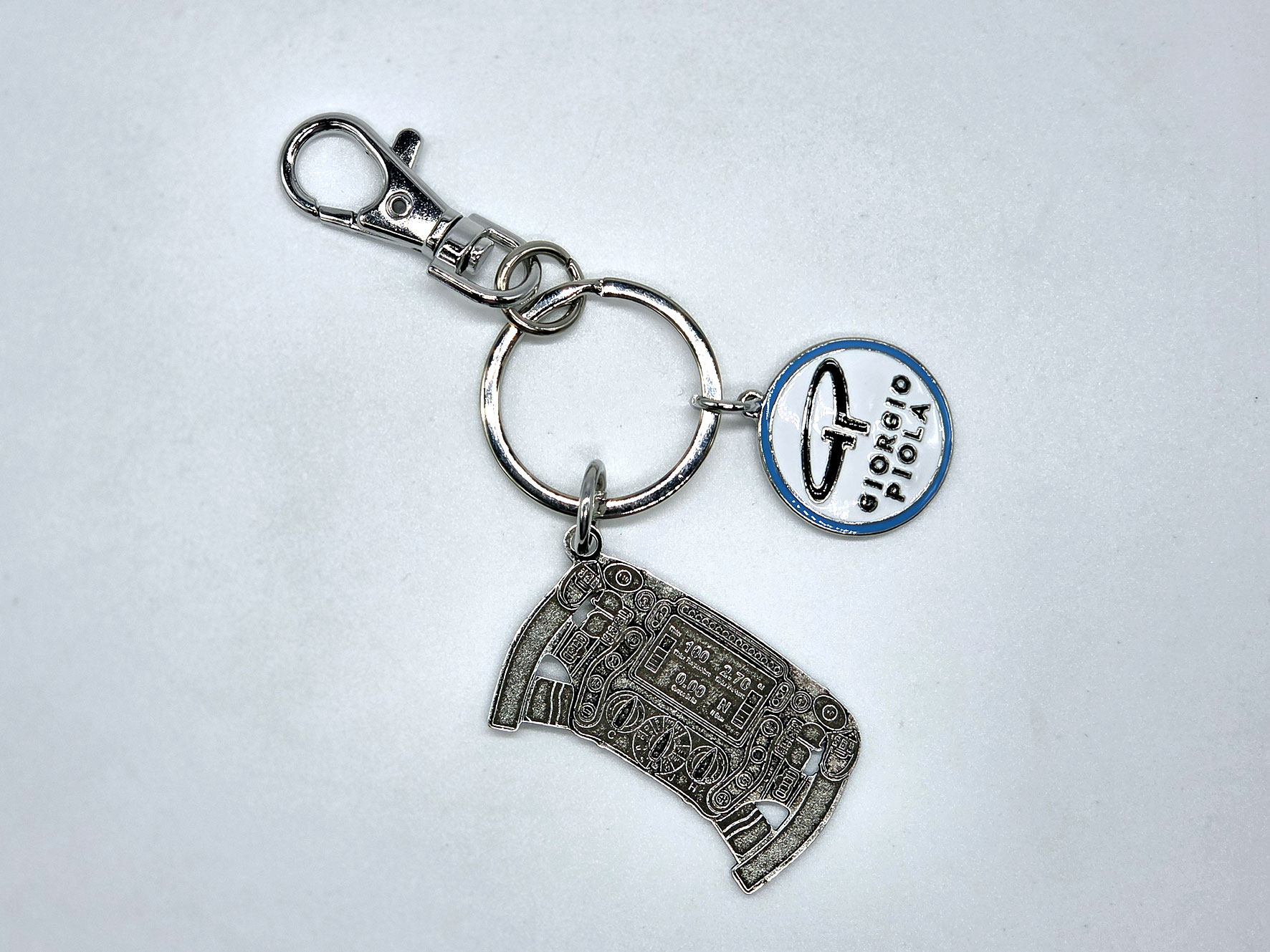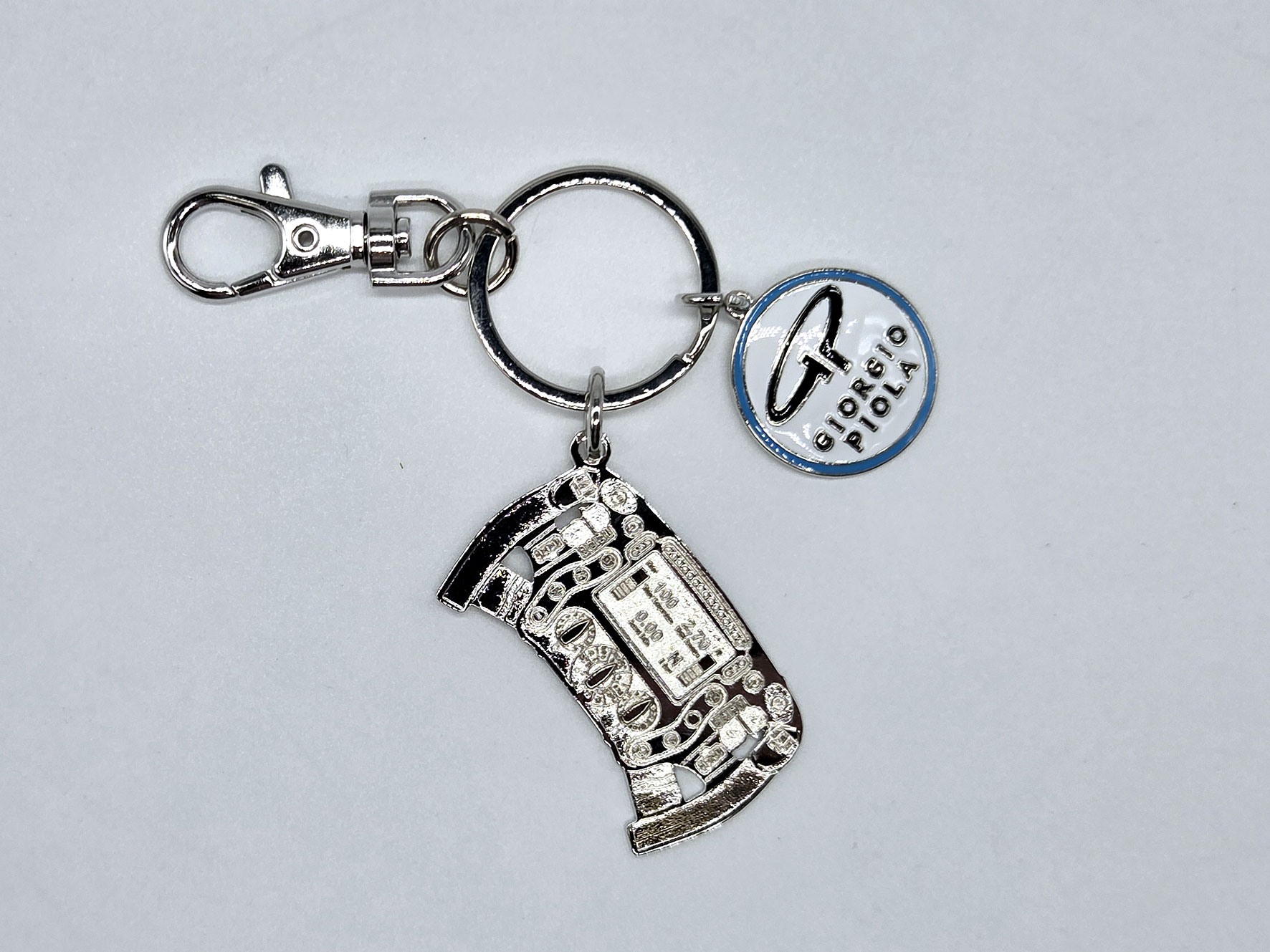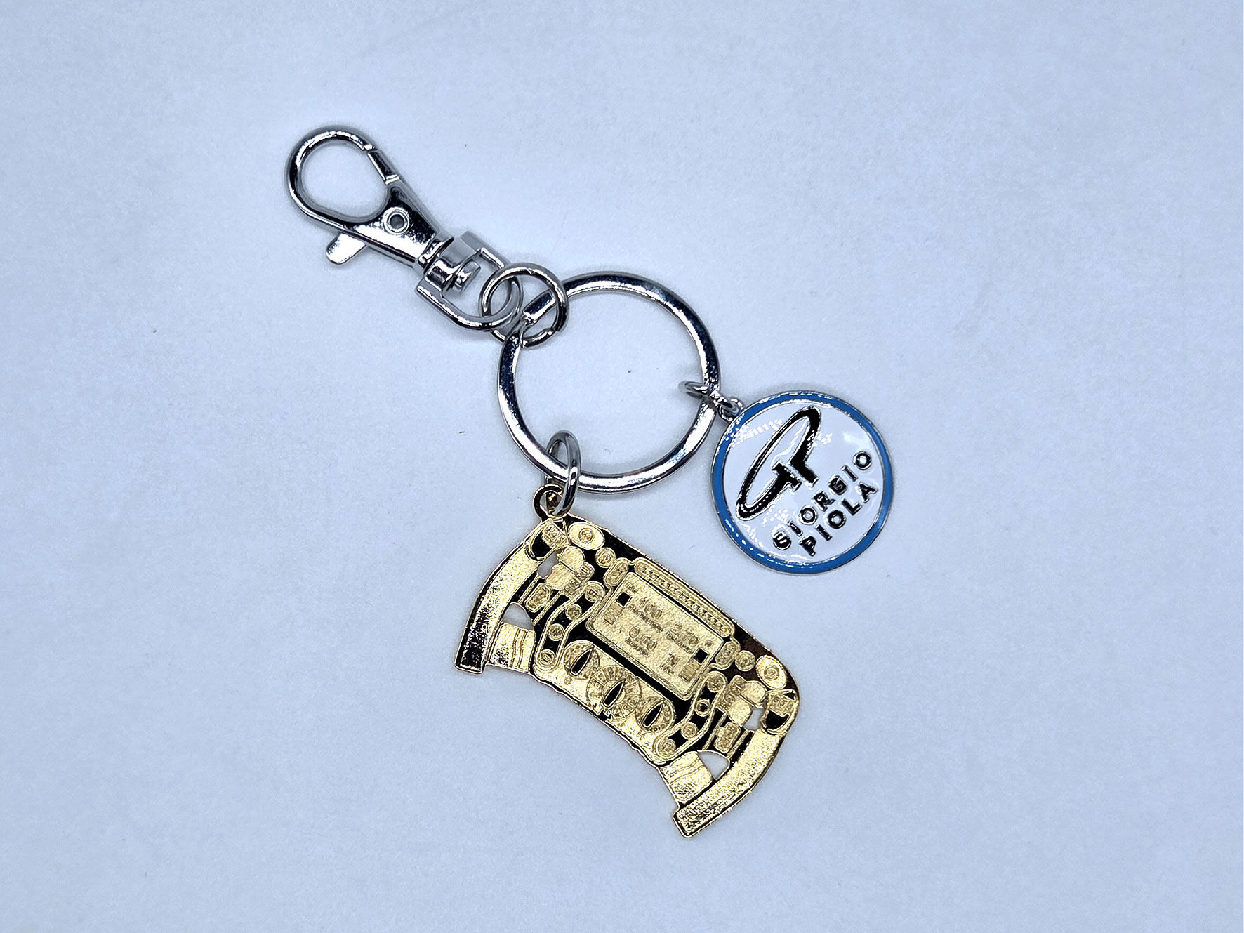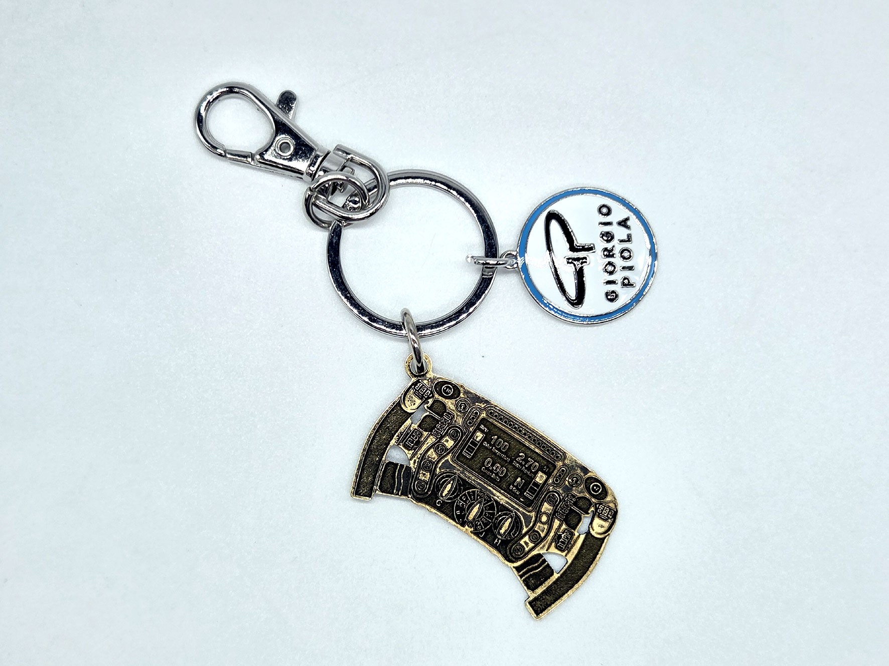 Keyring with McLaren-style F1 steering wheel based on Giorgio Piola’s original design and featuring the Giorgio Piola logo on a hand-enamelled chrome-plated medal. The brass steering wheel, with high-quality gold/silver/antique gold/antique silver finishes, measures approximately 53×50 mm. The keyring includes a carabiner clip so it can be easily hung anywhere.
